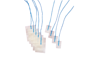Non radio-opaque types have black nylon thread bonded with the patties. Radio-opaque types have ‘blue polypropylene with bariun sulphate’ thread bonded with the patties.