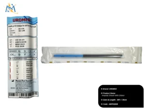 UROMED Amplatz Sheath With Dilator merupakan selubung (sheath) Amplatz yang dilengkapi dengan dilator. Selubung Amplatz biasanya digunakan dalam prosedur perkutan (melalui kulit) untuk memberikan akses ke saluran kemih, khususnya ginjal. Dilator digunakan untuk melebarkan jalur akses sebelum selubung dimasukkan. Produk ini berukuran 30 French (Fr) dengan panjang 30 cm. Informasi pada kemasan juga mencantumkan nomor LOT (UD 03-23), kode produk (AMPD3030), tanggal produksi (Maret 2023), dan tanggal kadaluarsa (Februari 2028). Produk ini disterilisasi dengan Etilen Oksida (EO) dan diproduksi oleh Manish Medi Innovation.