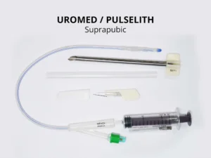 The image shows a UROMED/PULSELITH suprapublic catheterization kit. This medical device is specifically designed for suprapublic catheterization, a procedure where a catheter is inserted directly into the bladder through a small incision in the lower abdomen. The kit typically includes a catheter, a trocar, a scalpel, a syringe, and other necessary accessories for the procedure. Suprapublic catheters are often used for long-term urine drainage in patients who are unable to urinate on their own or who have urinary retention.