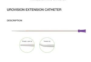 UROVISION EXTENSION CATHETER merupakan kateter ekstensi yang berfungsi sebagai perpanjangan dari kateter urin yang sudah terpasang. Tujuannya adalah untuk memfasilitasi drainase urin ke kantong penampung yang terletak lebih jauh dari lokasi pemasangan kateter awal. Produk ini tersedia dalam dua jenis ujung (tip): ujung lurus terbuka (straight, open tip) dan ujung Tiemann. Ujung lurus terbuka memiliki lubang di ujungnya untuk drainase yang mudah, sedangkan ujung Tiemann memiliki ujung yang melengkung untuk memudahkan insersi, terutama pada pasien pria dengan penyempitan uretra. Dengan adanya kateter ekstensi ini, pasien memiliki fleksibilitas lebih dalam penempatan kantong urin dan mengurangi ketegangan pada kateter utama.