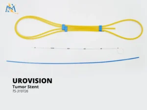 The image shows a UROVISION Tumor Stent. This is a medical device designed to hold open a narrowed or blocked passageway within the urinary tract, such as a ureter or urethra. The stent is a thin, flexible tube that is inserted into the body through a small incision. It is often used to treat conditions such as kidney stones, tumors, or strictures that can block the flow of urine. The stent is typically left in place for several weeks to months, and then removed when it is no longer needed.